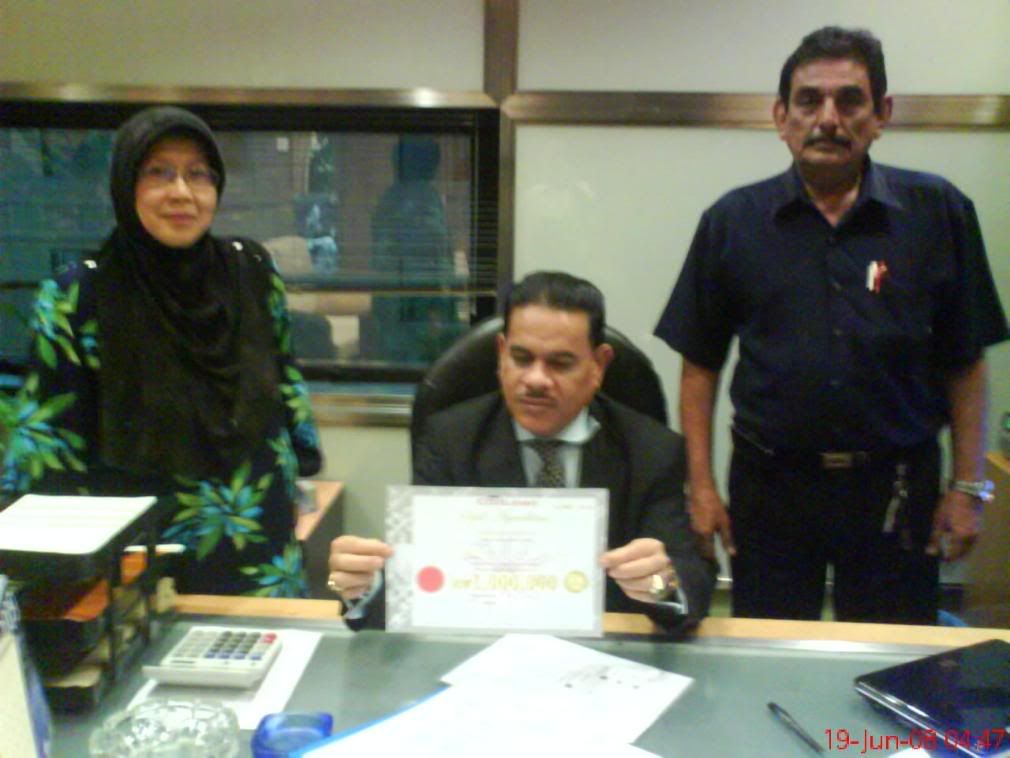 "Gambar : Dari kiri Puan Khadijah, En. Ibrahim Nawabdin dan Dato' Mat Amin. Dato' sedang menunjukkan Sijil Agreditasi RM1,000,000.00 yang akan di berikan kepada semua ahli PKU yang telah berdaftar"